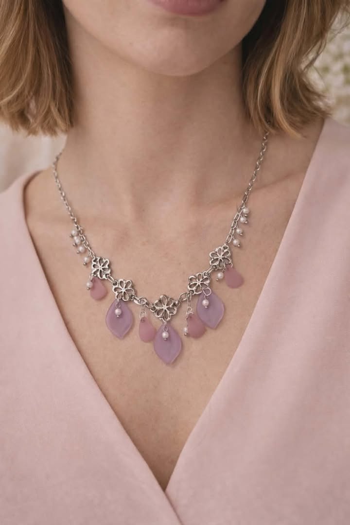 Collier en acier inoxydable argenté fleurs et pétales rose lila