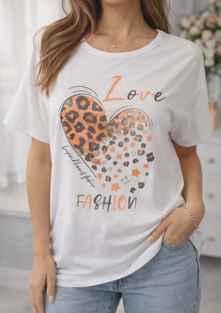 T-shirt blanc au style tendance avec son imprimé cœur léopard et étoiles orange.